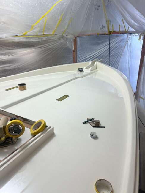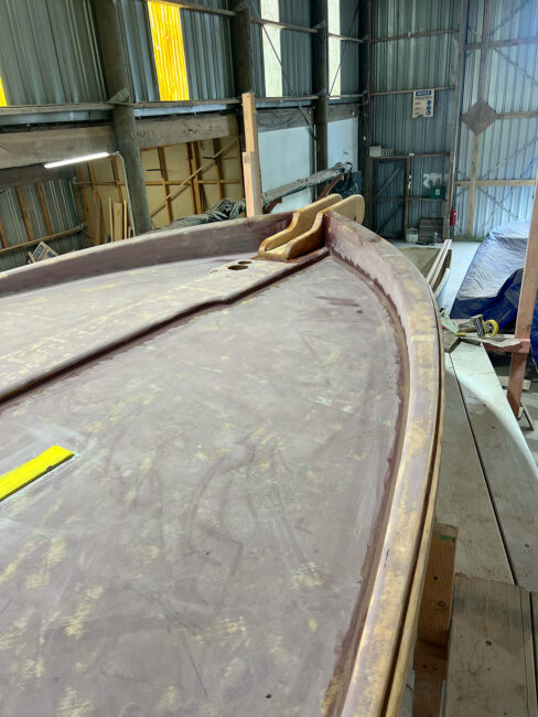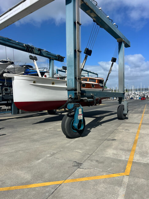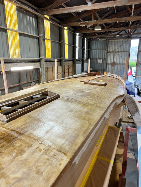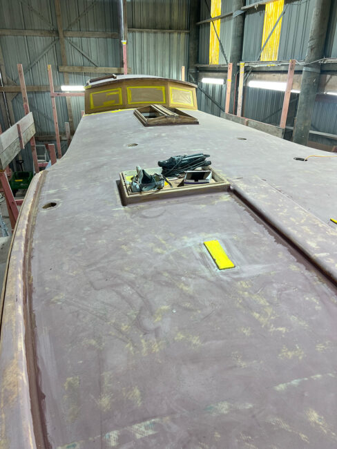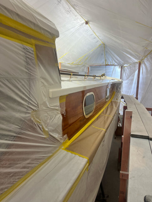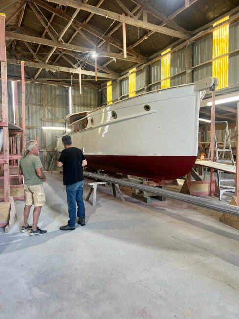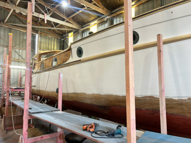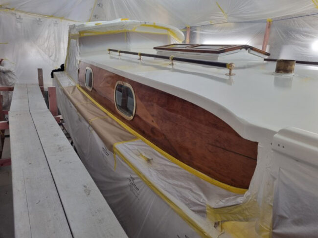 Another full restoration in our Whitford shed, including structural repairs, a new boarding platform, bowsprit and anchoring system. Full cabintop, deck and hull paint and new cabin side varnish.